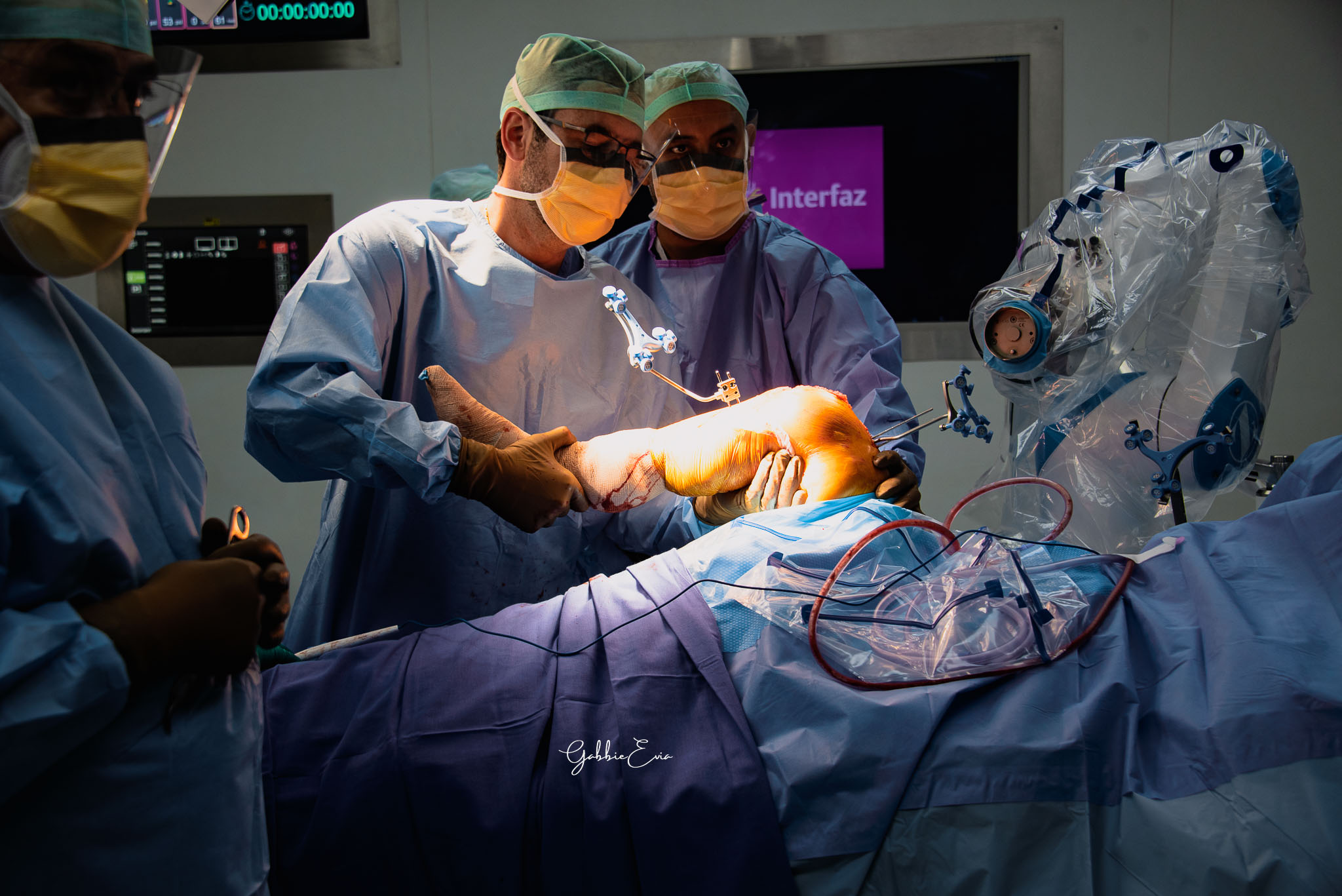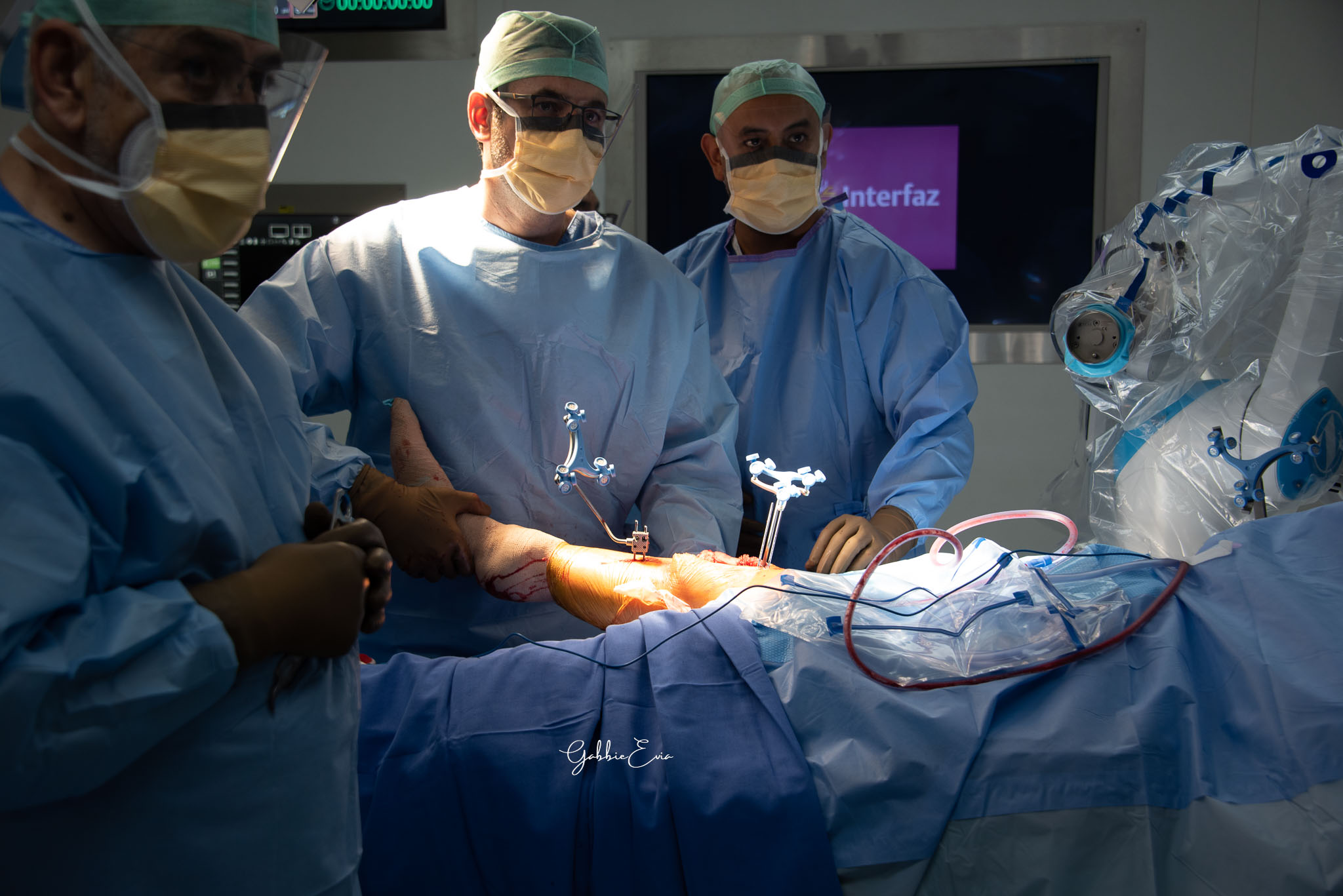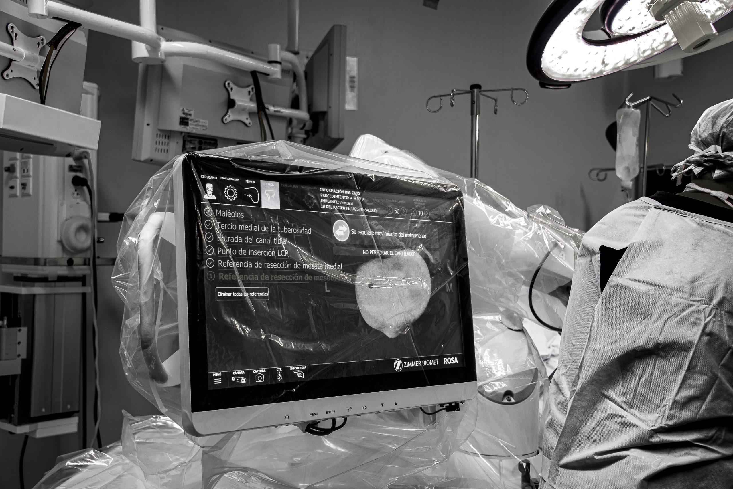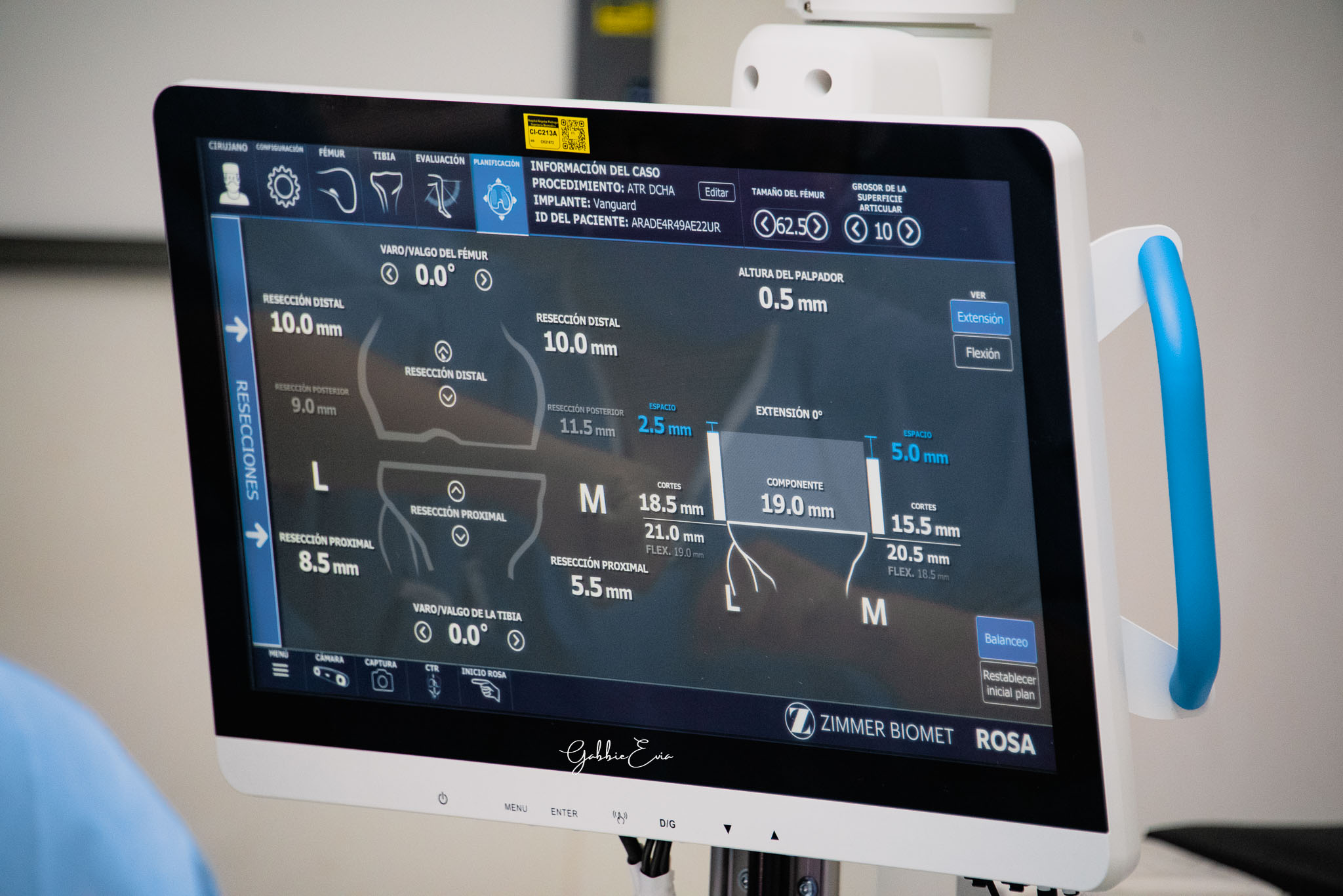 Trabajamos en conjunto con dos marcas de robots para asistir una cirugía de remplazo articular con base a la planeación y ejecución de la misma, que nos ayuda a tener una mejor precisión y mejora los tiempos de cirugía así como la recuperación del paciente, previamente programado y manejado por los médicos: